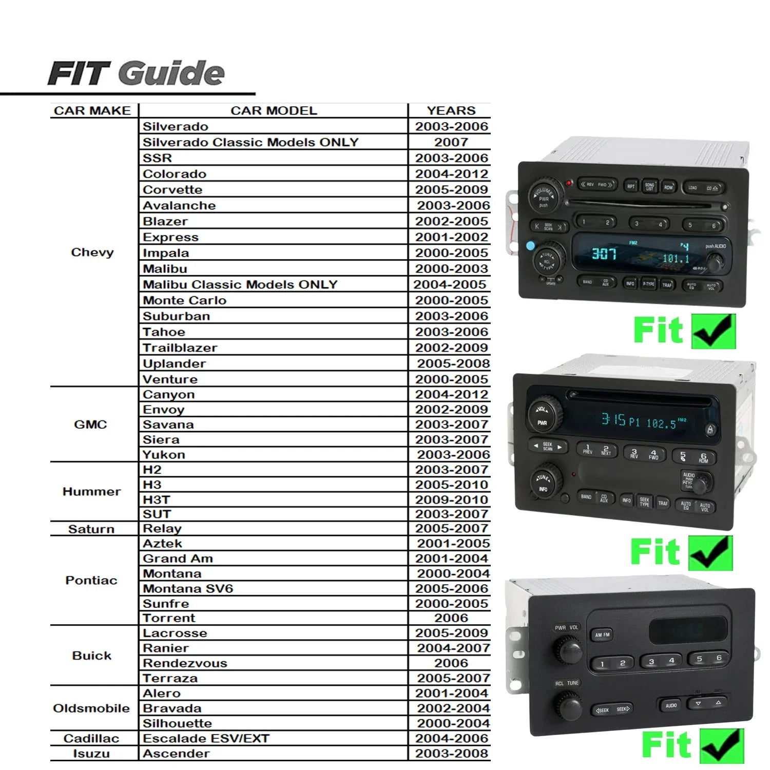 Compatibility: Plug and play Designed for Chevrolet Chevy Silverado SSR 2003-2006,GMC Siera Yukon 2003-2006,Hummer H2 2003-2007. And more selected models ,please check the table. package come with everything you need.Include the stereo,wire harness,dash frame and pry tool.