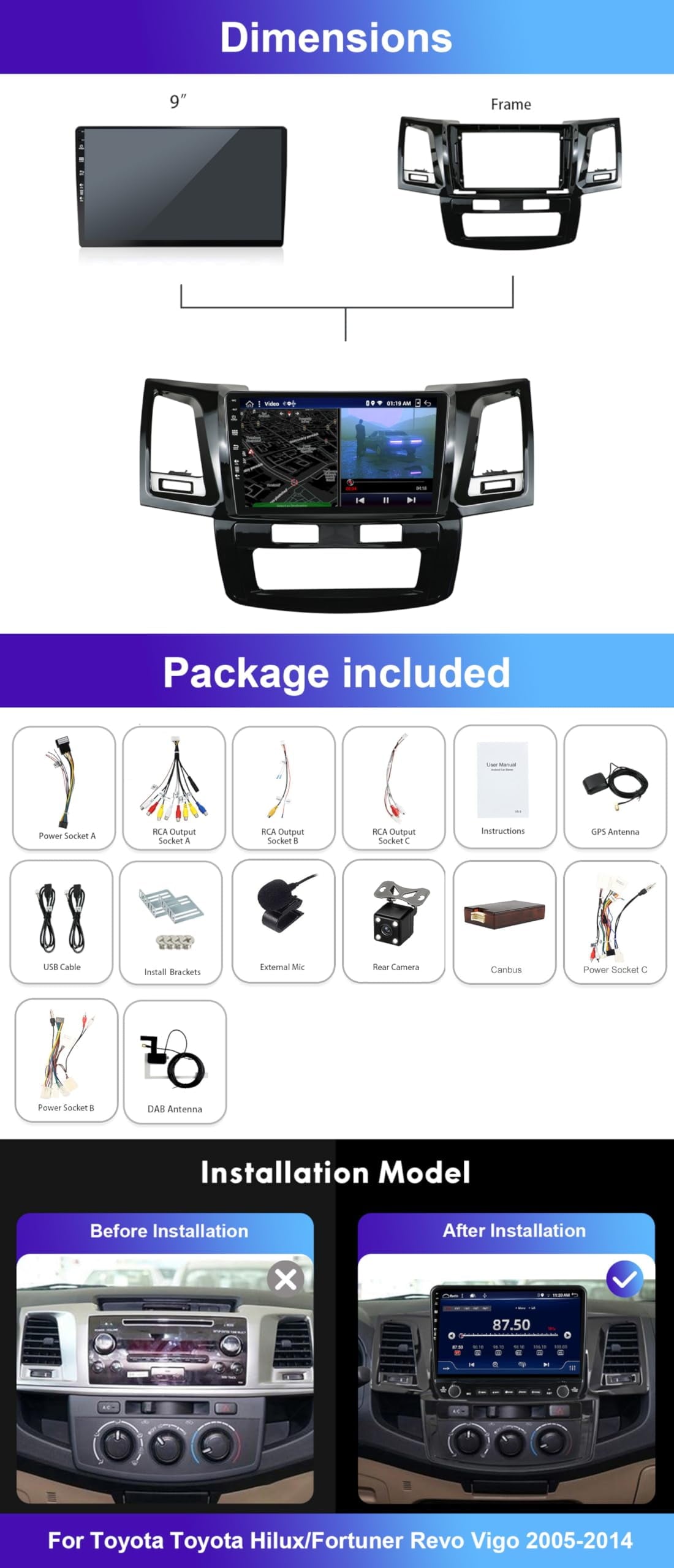 The latest version Android system,equiped with 8-core 64 bit processor.Ultra-low power consumption 14nm process automotive grade chip.Built in 6GB RAM + 128GB ROM, allows you to download your favorite apps. Compatible models The car radio fit for Toyota Hilux/Fortuner Revo Vigo 2005-2014