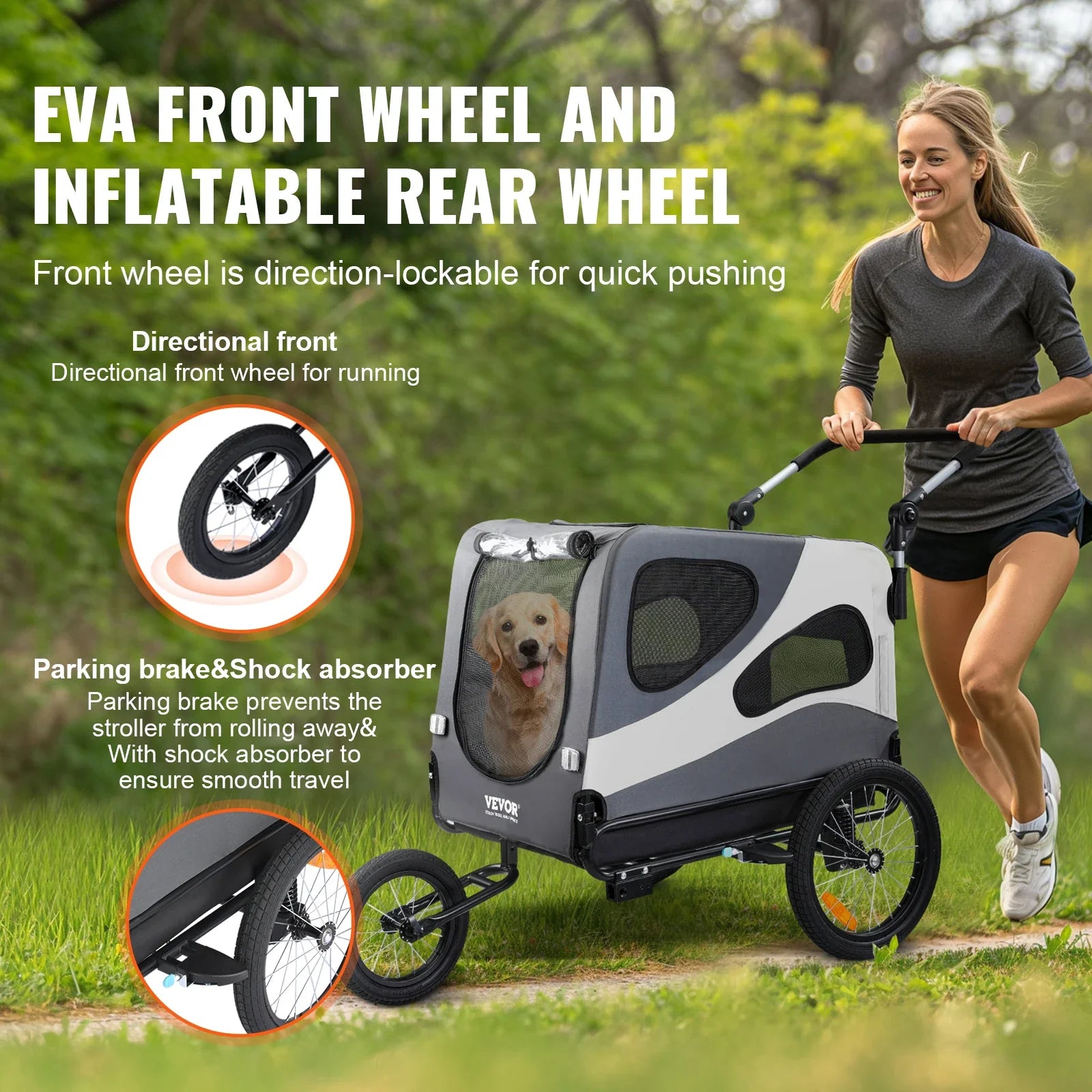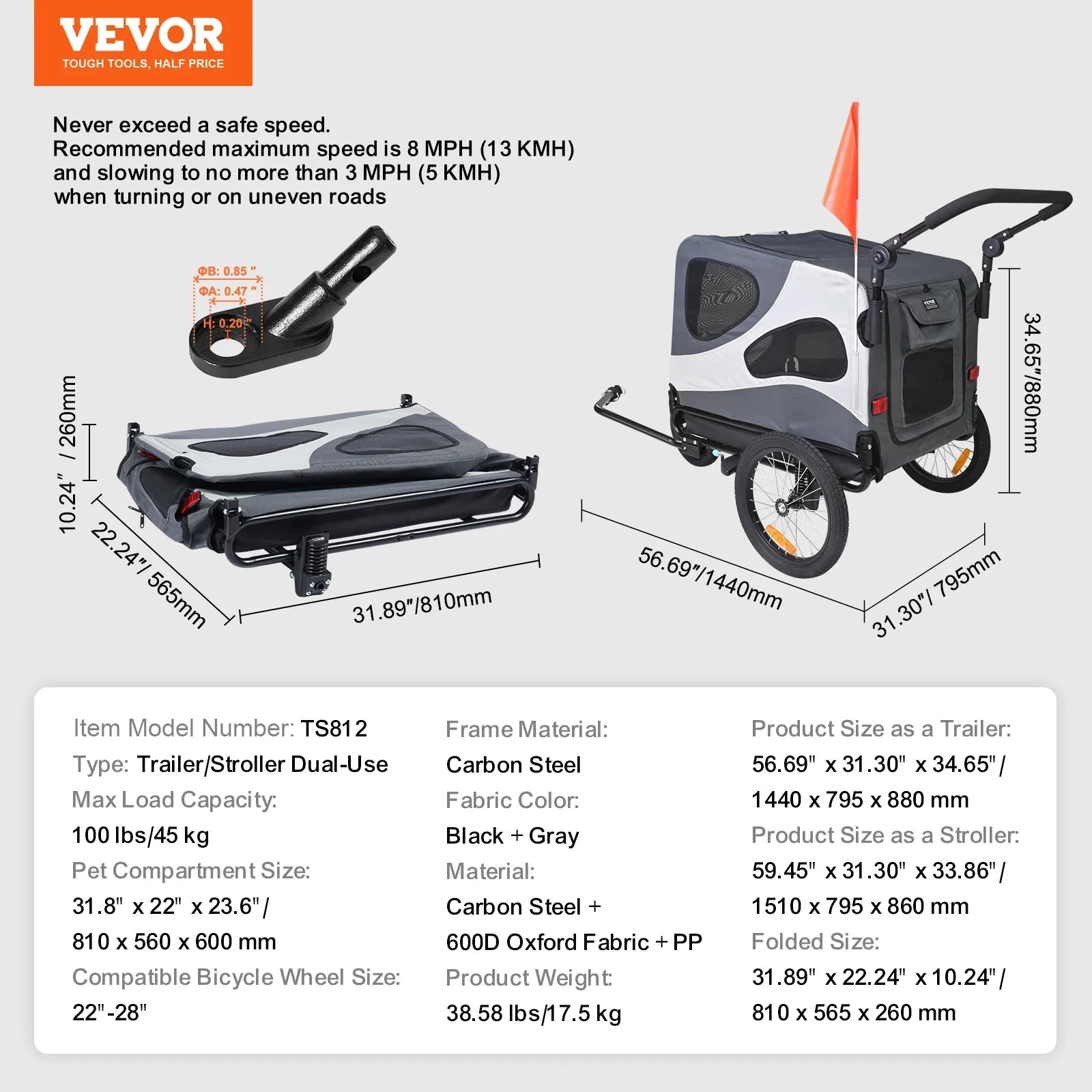 VEVOR 100lbs Dog Bike Trailer 2-in-1 Pet Stroller Cart Bicycle Carrier Folding Cart Frame with Wheels Reflectors Flag for Dogs