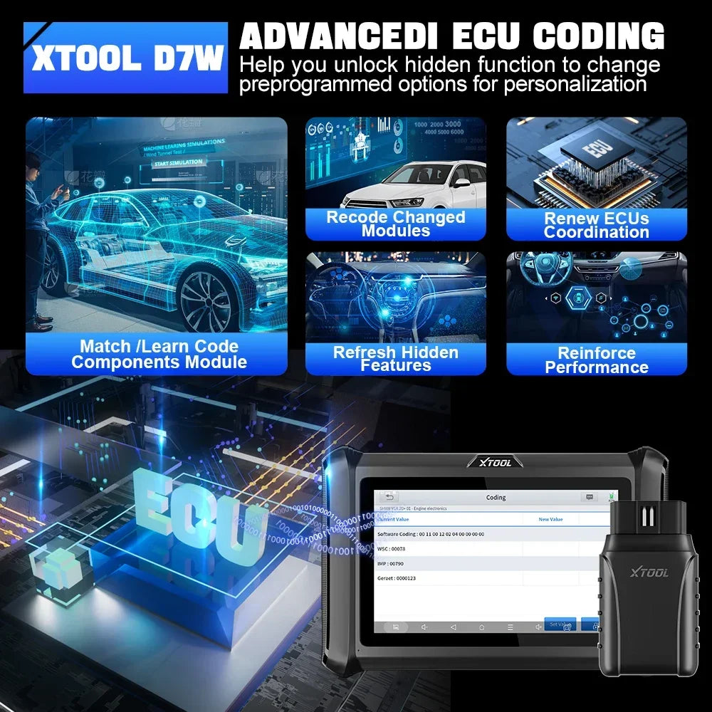 For Benz,for BMW,for VW,XTOOL D7W ECU Code feature allows you to code/adapt new ECUs and customize the vehicle as needed, optimizing specific performance to improve fuel efficiency, reduce power loss, enhance the durability of mechanical parts, etc.