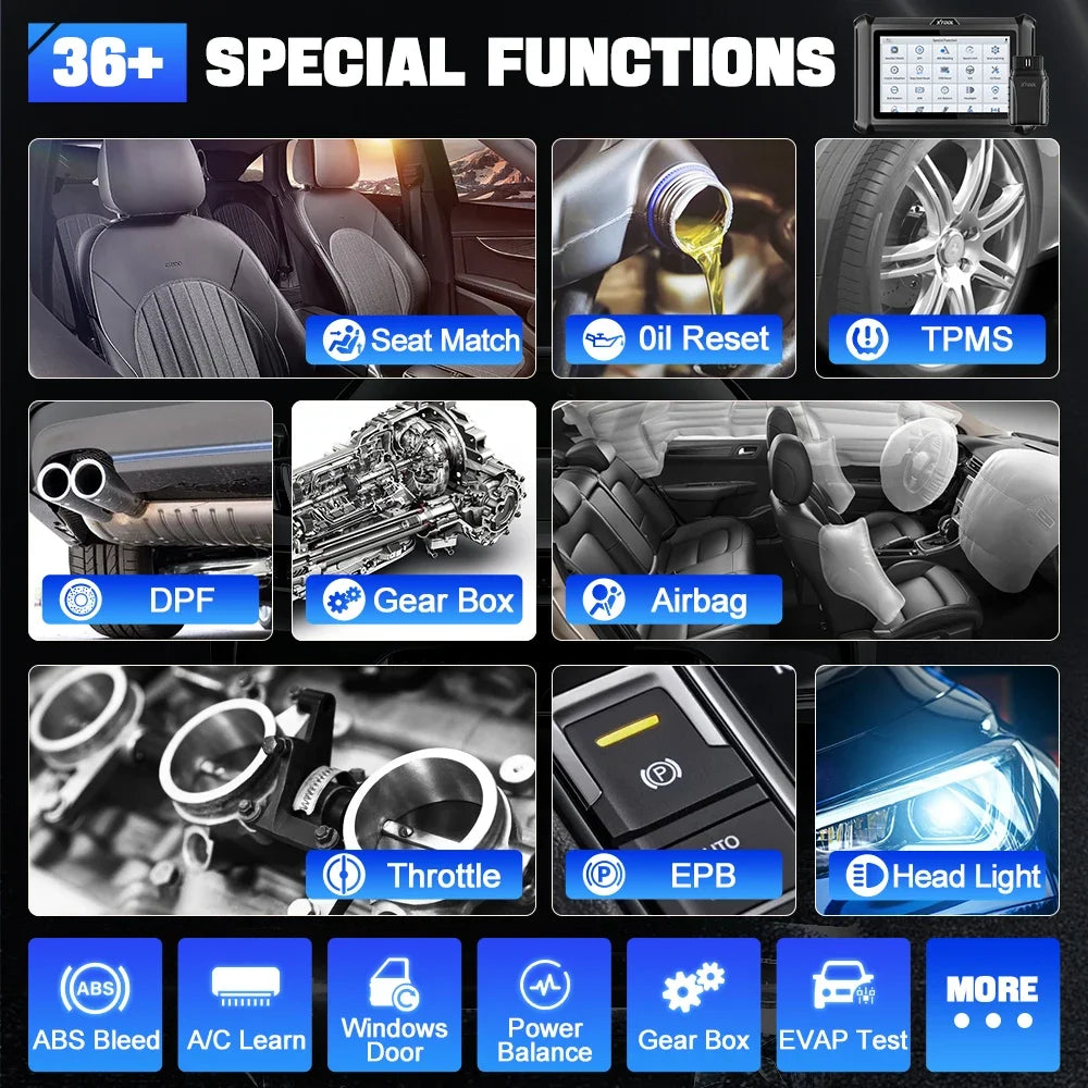 The naturally intuitive "Special Functions" menu empowers you to quickly start module services, including ABS Bleed, Injector Coding, Power Balance, Key Programming, Fuel Trim Reset, Oil Reset, EPB, SAS, DPF, BMS, Throttle, Gearbox Match, Suspension, Start/Stop Reset, Electronic Pump Activation, and etc.
