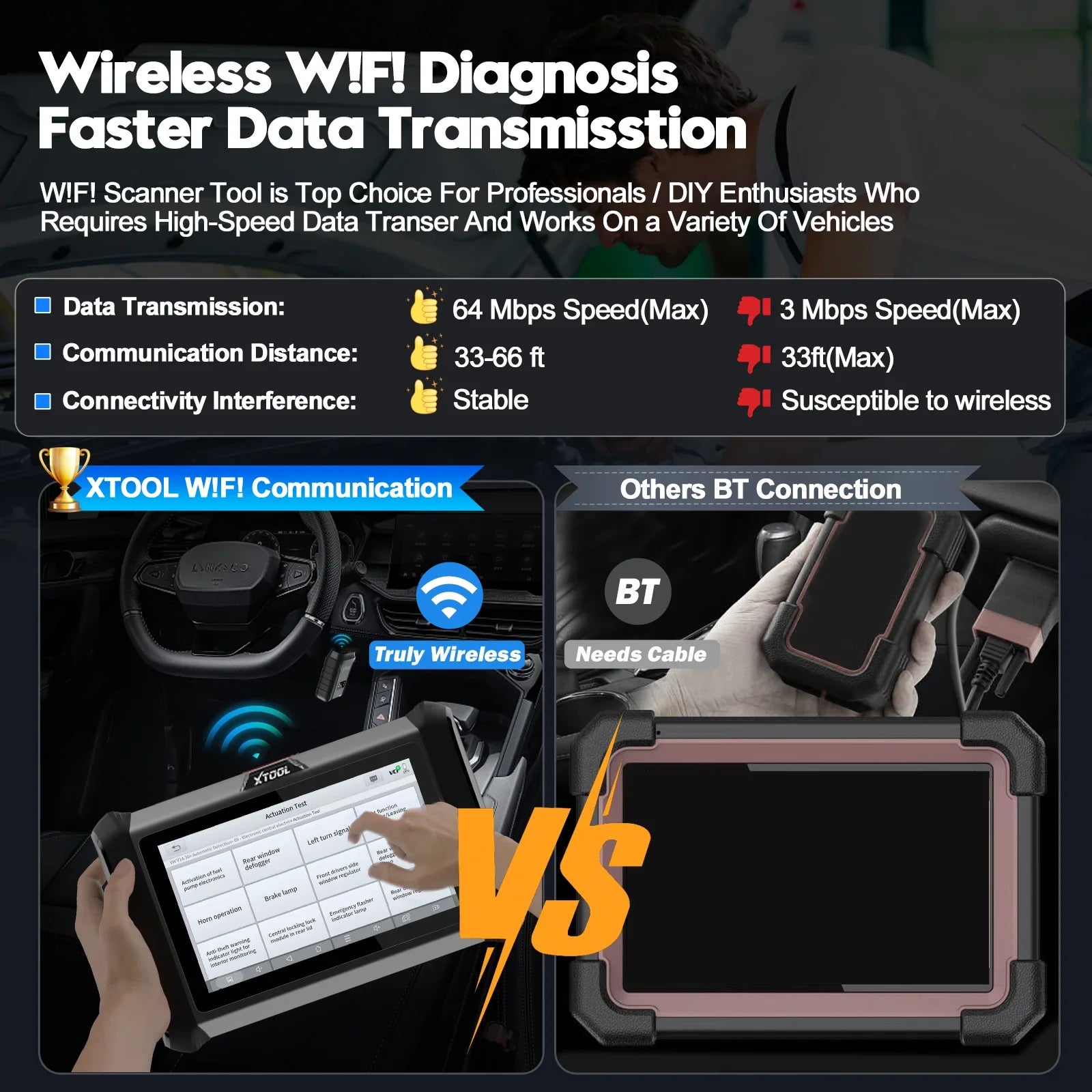 XTOOL D7W WIFI Connection,has longer transmission distance, faster speed and better compatibility, which can improve the efficiency of car maintenance and save valuable time.The distance for WiFi connection is approximately 30-100M ,depending on the environment.The transmission speed is 64 Mbps(Max).