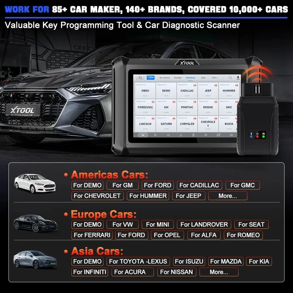 XTOOL D7W all-in-one scanner is specially customized for large Maintenance Shops, Workshops, Car Dealers, Auto Mechanic. Work for 12V Petrol Sedans, SUVs, Minivans and Light-Duty Trucks across the globe, including: