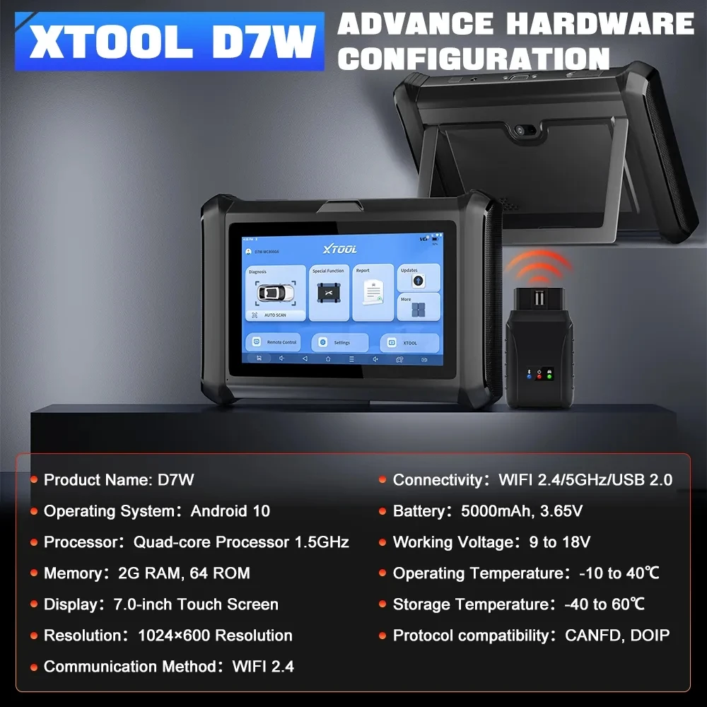 D7W is an automotive smart diagnostic system with a 7-inch LCD display and Android 10 OS, which is designed for mechanics, electricians, and car maintenance shops. It supports automotive diagnostics for full-system, including reading ECU version information, reading fault codes, live data, and freeze frames.