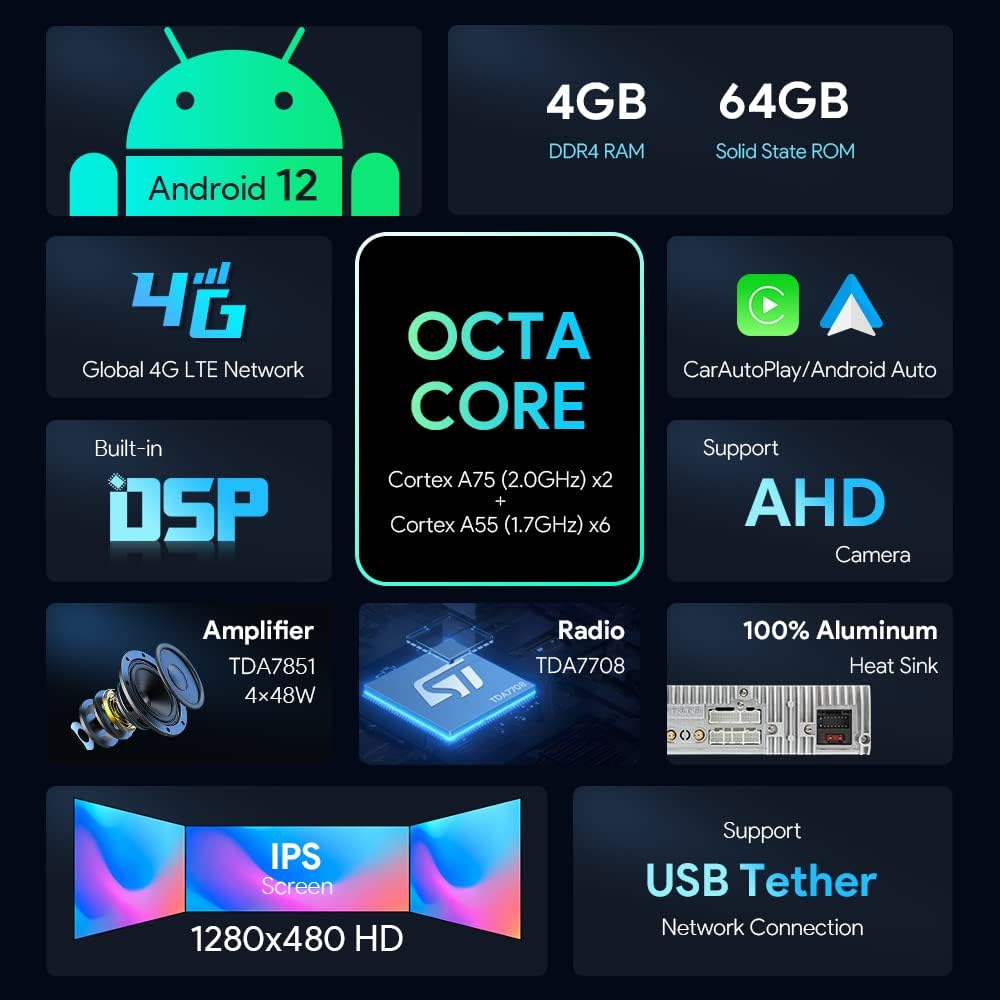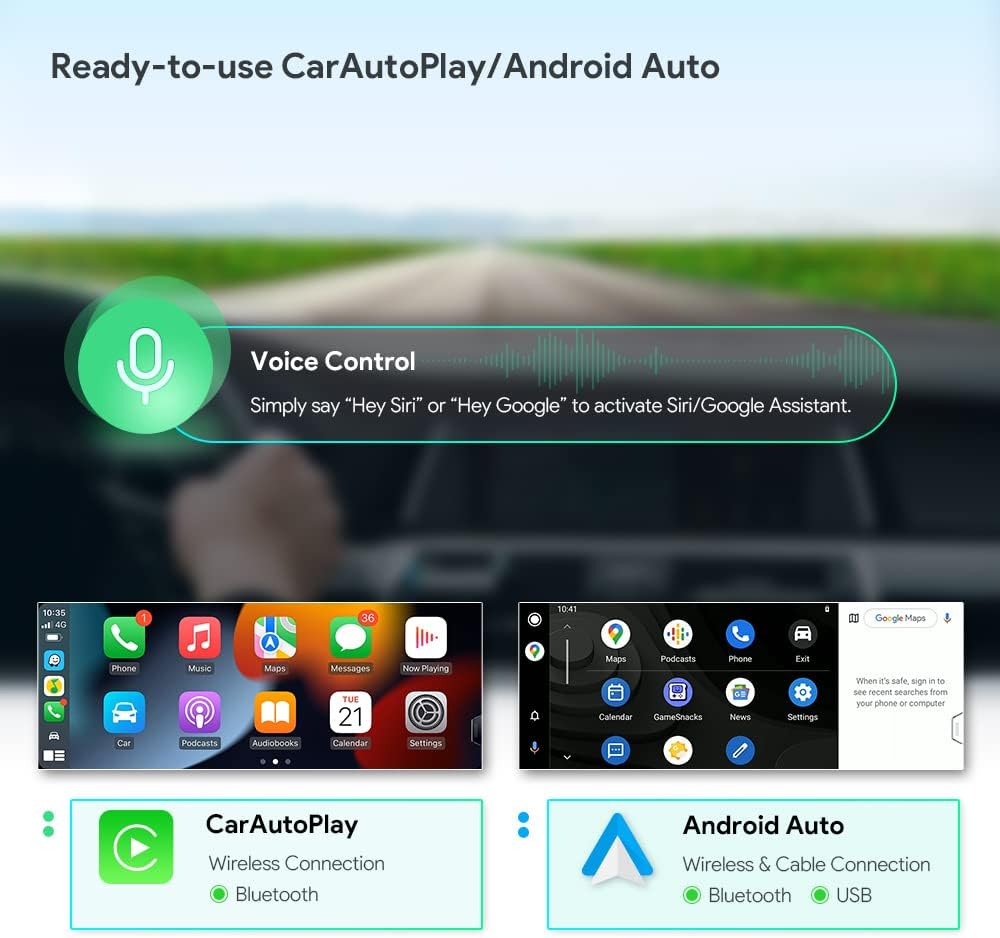 Built-in Wireless Car Auto Play; Built-in Wired Android Auto; Bluetooth 5.0 Connection for calls and voice control.